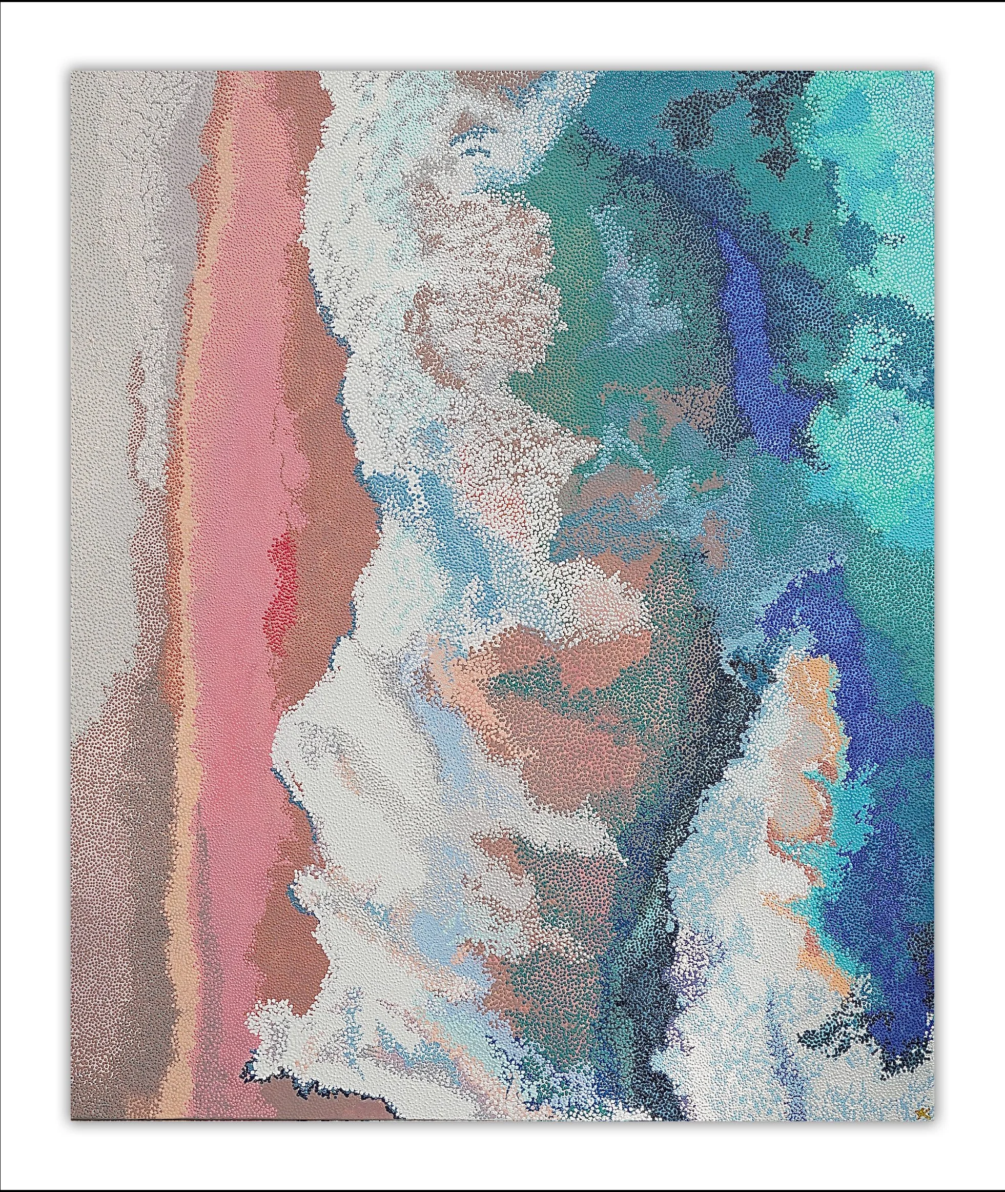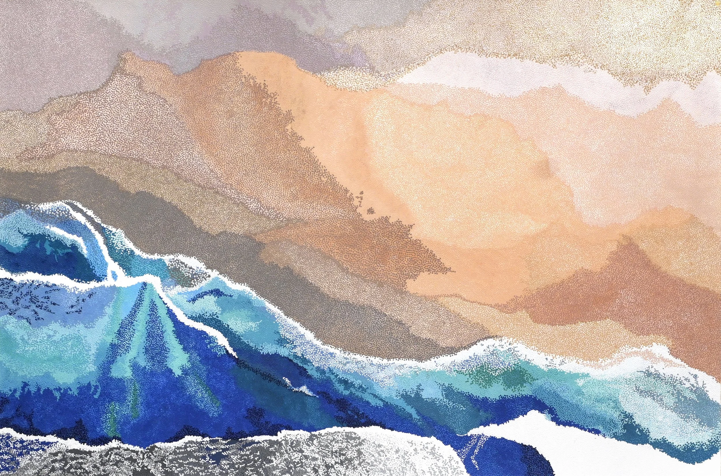 The sea has many forms. Aboriginal story and song speaks to sea since time immemorial. The sea itself also tells us a story. It’s tide marks explain tidal changes, ice ages, big thaws and can help us to track back to a time that feels more like fantasy than reality. The sea hold innumerable secrets, its is argued by scientists that it was host to the very first life-creating organism long before man was even a twinkle in the night sky. And that too is linked, our birrung (stars) are our time keepers. Aboriginal people around the globe have stories about reading the stars for navigation, and to give some prediction to the seas movements via tides. To Baraya Garrigarrang Ngura, we are calling up all of the beautiful spirits, memories, history and magic that orientates our worlds. By singing up the Sea Country we acknowledge her long life, her many changes and her eternal movement within our own selves. This body of work is my homage to Garrigarrang Ngura; physical sea places themselves, and also to the times during the season cycles where incredible things happen to the sea and the beauty and character is unparalleled.